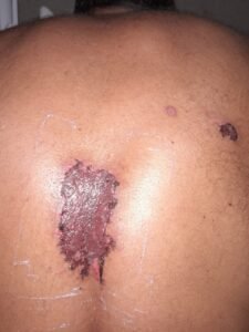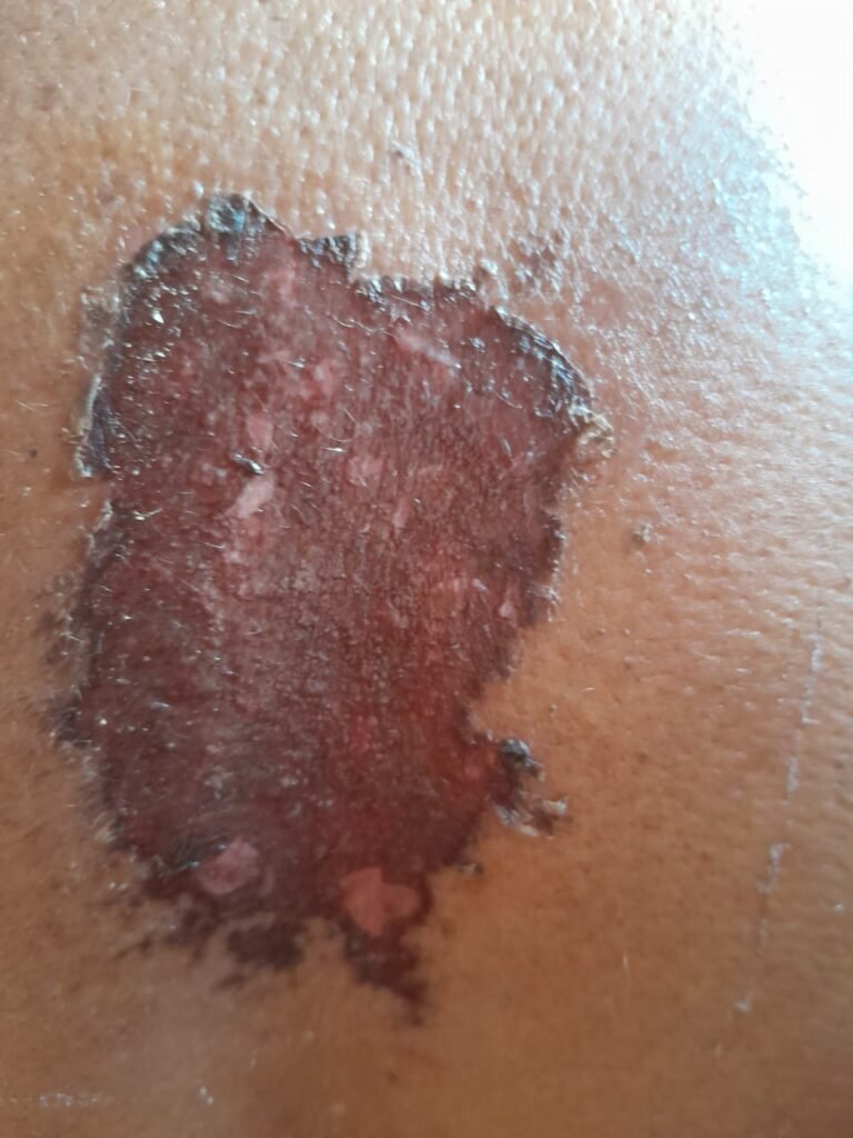 As imagens enviadas pela denunciante mostram lesões graves na pele, compatíveis com queimadura química.
