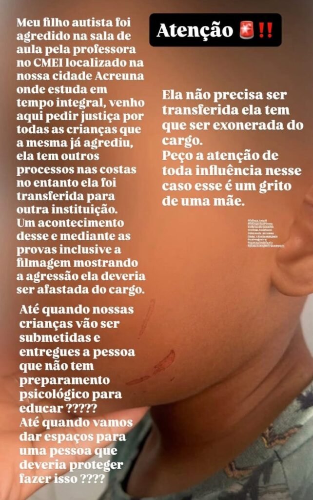 uma denúncia gravíssima chamou a atenção em Acreúna. Uma mãe compartilhou sua dor e indignação nas redes sociais, relatando que seu filho autista foi agredido n...