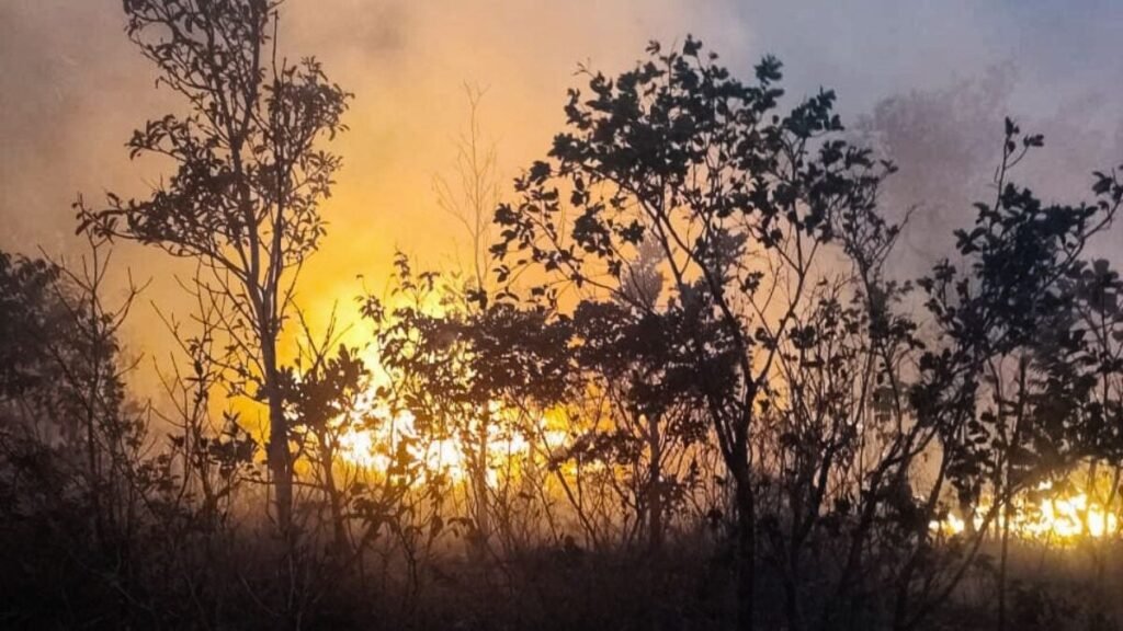 Brigadistas e militares do Corpo de Bombeiros atuam no combate a um incêndio florestal, potencialmente criminoso, que já consumiu mais de 25 mil hectares de veg...