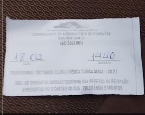 De acordo com o comprovante de agendamento, a consulta estava marcada para às 14h40 com a médica clínica geral Dra. Maria Clara. O documento orientava que a paciente chegasse com antecedência de 40 minutos e apresentasse documentos como RG e cartão do Sistema Único de Saúde (SUS).