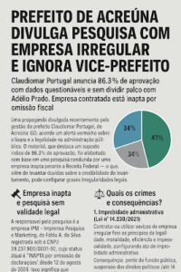 Uma propaganda divulgada recentemente pela gestão do prefeito Claudiomar Portugal, de Acreúna-GO,, acende um alerta vermelho sobre a lisura e a legalidade na administração pública. O material, que destaca um suposto índice de 86,3% de aprovação, foi elaborado com base em uma pesquisa conduzida por uma empresa inapta perante a Receita Federal — o que, além de levantar dúvidas sobre a credibilidade do levantamento, pode configurar graves irregularidades legais.