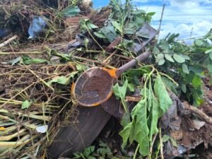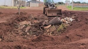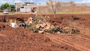 A população de Acreúna está indignada com o depósito irregular de entulho e lixo em uma ilha da Avenida José Borba, no centro da cidade. As imagens mostram uma grande quantidade de resíduos, incluindo móveis, plásticos e lixo orgânico, jogados em uma área de terra.